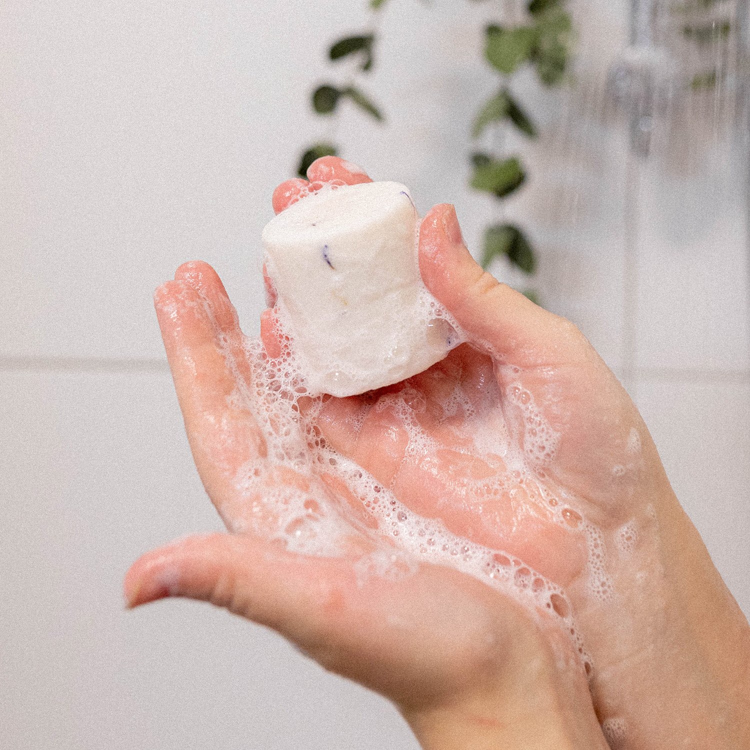 Sodium cocoate, Maris sal (sea salt), Sodium shea butterate, Sodium canolate, Aqua, Sodium safflowerate, Glycerin, Rosmarinus officinalis (rosemary) leaf oil, Mentha piperita (peppermint) oil, Sodium lactate, Mica, CI 77891, CI 77492, CI 77007, CI 77288, Sodium chloride, Limonene*, Beta-caryophyllene*, Menthol*, Camphor*, Pinene*. * = doftkomponent i eterisk olja.