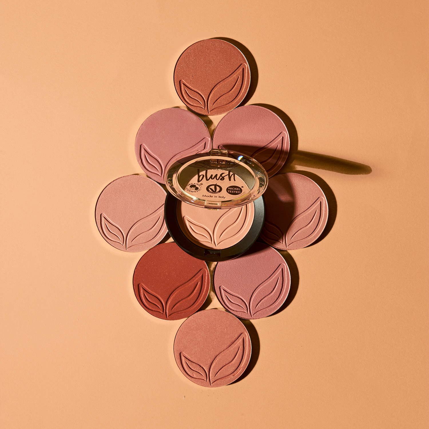 Mica, Calcium aluminum borosilicate, Talc, Titanium dioxide (CI 77891), Caprylic/capric triglyceride, Silica, Iron oxide (CI 77491), Quartz, Simmondsia chinensis (jojoba) seed oil*, Prunus amygdalus dulcis (sweet almond) oil*, Glycine soja (soybean) oil, Magnesium stearate, Tocopheryl acetate, Tin oxide, Levulinic acid, Tocopherol, Glycerin, Sodium levulinate, Water (aqua), Helianthus annuus (sunflower) seed oil*, Fragrance (parfum)**, Citronellol**, Limonene**, Linalool**. * = ekologisk, ** = från naturliga eteriska oljor.